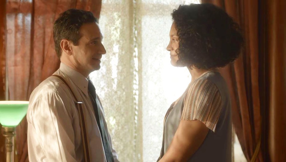 | João Aranha (Caco Ciocler) e Shirley (Barbara Reis) conversam sobre Inês (Gabriella Saraivah/Carol Macedo) — Foto: Globo |